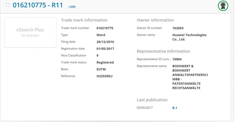 有网友发现,华为在欧洲申请了R17、R19和R21三个商标,用于智能手机、手机配件、耳机、保护套、外壳、屏幕保护膜、电池和电池充电器等品类上。