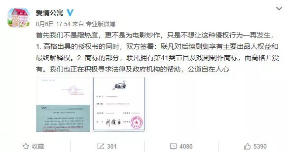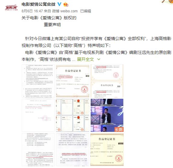 消息一出便引起了热议,同时,电影《爱情公寓》官微发博也晒出了相关文件并称:电影《爱情公寓》由“高格”基于电视系列剧《爱情公寓》编剧汪远先生的原创剧本制作,“高格”依法拥有电影《爱情公寓》完整著作权,并已事先获得了一切必需的法律授权与许可。对于就《爱情公寓》著作权及知识产权进行恶意诽谤和骚扰的行为,“高格”保留对其进行诉讼乃至追责的权利。