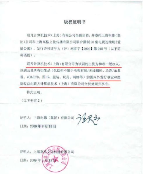 并晒出的多份文件,包括前两季制作协议书,显示联凡 “拥有本剧有关的一切权利。” 其中,“版权证明书”显示,联凡是该剧(《爱情公寓》)的出资方和唯一版权人。