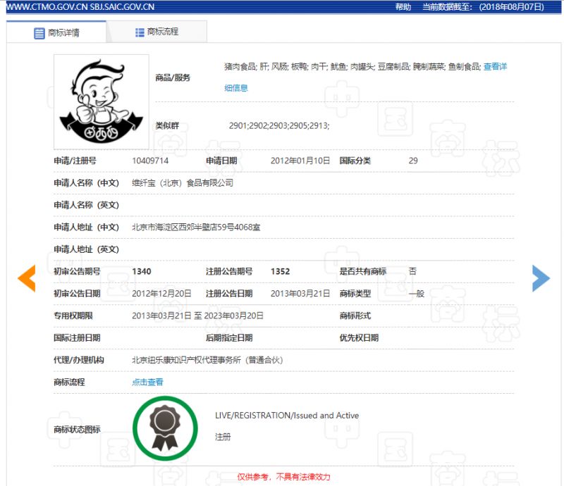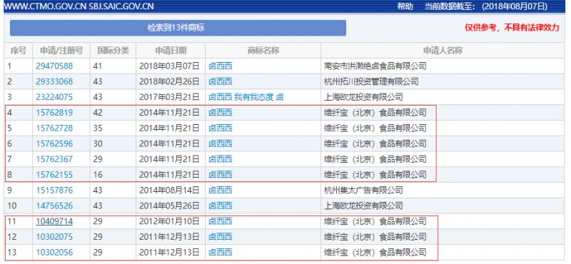 “卤西西”商标属于维纤宝(北京)食品有限公司,该公司2011年成立于北京,经营范围是销售食品。据中国商标网公开信息,该公司自成立起,注册了多个“卤西西”商标,涵盖食品、印刷品、广告营销等多个种类。