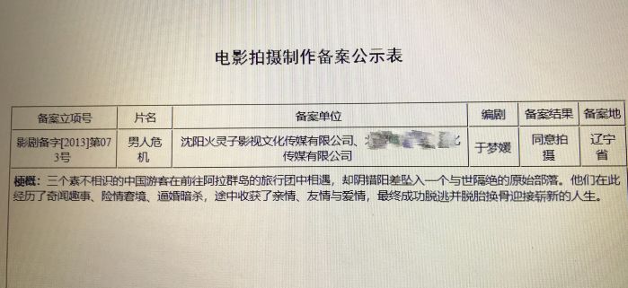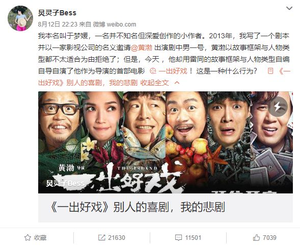表示看完《一出好戏》后,觉得该片抄袭借鉴了《男人危机》剧本中的故事创意与框架,并且附上在广电总局备案信息。