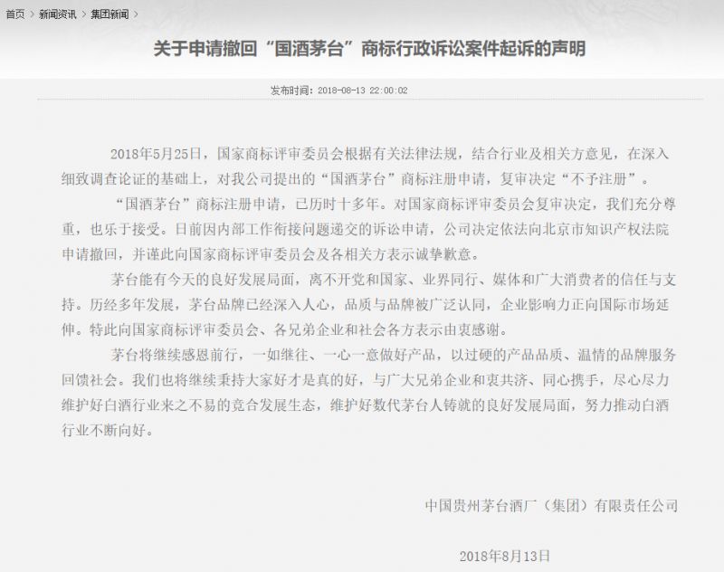 要说最近商标行业最火的事当属茅台撤回起诉国家商标评审委员会并致歉,对“国酒茅台”商标的执念坚持了17年,申请了10次,在13日茅台终于肯释怀发声明,但也遭到了质疑,茅台突然服软是醒悟还是另有所图?