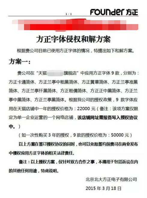 2015年方正又起诉了某天猫店铺未经授权使用方正字体,在和解方案中按照正常商用收费共22000/年。