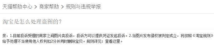 未经他人允许使用图片属于违反淘宝规则的行为,针对该行为一旦核实则淘宝将给予处理。处罚标准:不当使用他人权利扣2分并同时删除宝贝。(如您为第一次盗用图片行为,淘宝酌情不扣分,商品依旧删除。)