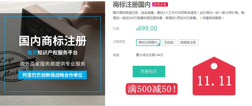 反之,如果你就是“爆款”的创作者或者你想打造“爆款”,那么相关知识产权保护一定不能落后,否则就算你投诉他人盗版,那么你也拿不出任何权利证明,所以你的损失可想而知。 其次,根据你的“爆款”商品性质不同,要进行有针对性的知识产权保护形式,当然进行全方位的保护是最优选择,但是在条件有限的情况下,选择合适的方式才能更大程度的保护您的权利! 例如商标可以保护您的品牌,专利可以保护您的技术,著作权则对您的设计稿、图文、音乐、影片等进行保护。 如您有需要或有问题,可以进入淘宝服务市场拾贝店铺直接咨询客服,或者留言评论与我们互动~ 迎接双十一!注册商标立减50活动只在拾贝淘宝服务市场哦~